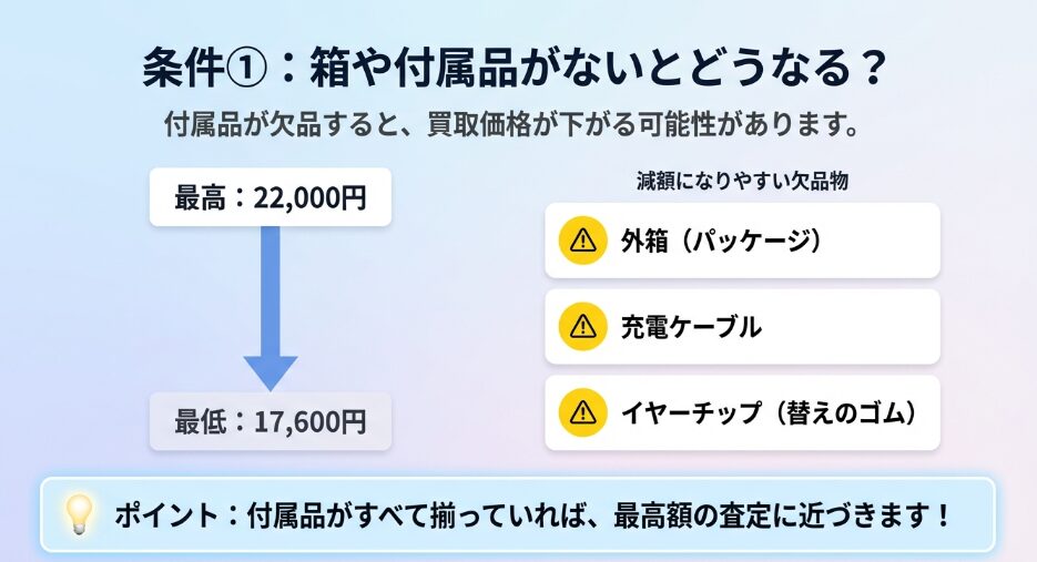 イヤホン本体と充電ケースだけで持ち込むと、数千円のマイナス査定になることが多いんです。