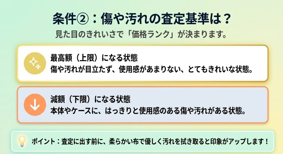 傷ありの本体や箱なしで持ち込むと、容赦なく減額基準が適用されてしまいます。