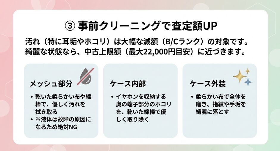 しかし、充電ケースに擦り傷があったり、落ちない汚れがあったりすると、容赦なく減額されてしまいます。