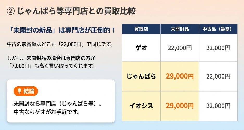 • イオシスやじゃんぱら等の専門店は、ゲオより相場が高いケースも多い