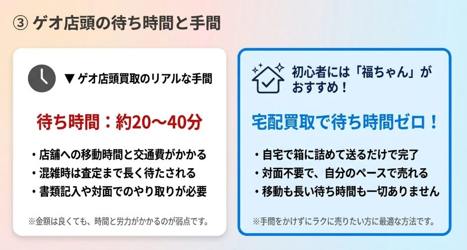 福ちゃんの宅配買取は、ゲオの店頭買取で発生する「査定待ちの時間」が一切ありません