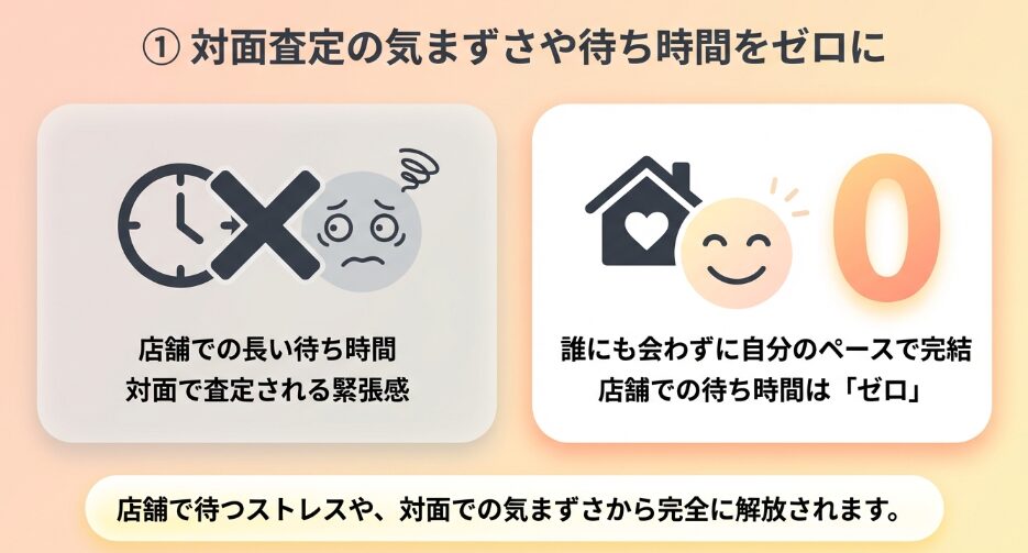 しかし、週末や混雑時には、店舗のカウンターで査定の順番を1時間以上も待たされる手間が発生します。