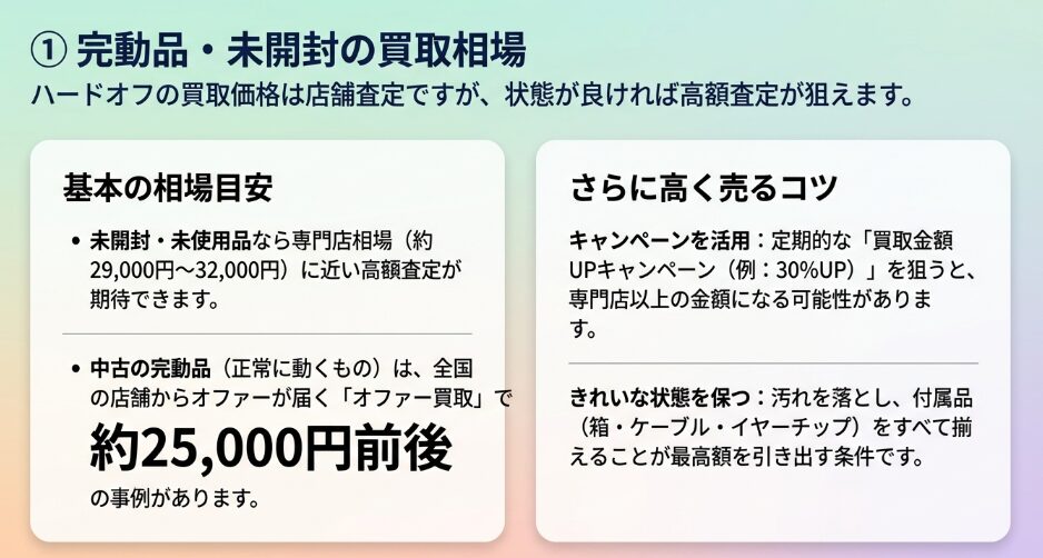 AirPods Pro 3のハードオフ買取価格相場において、完動品や未開封品は最も高く売れます。