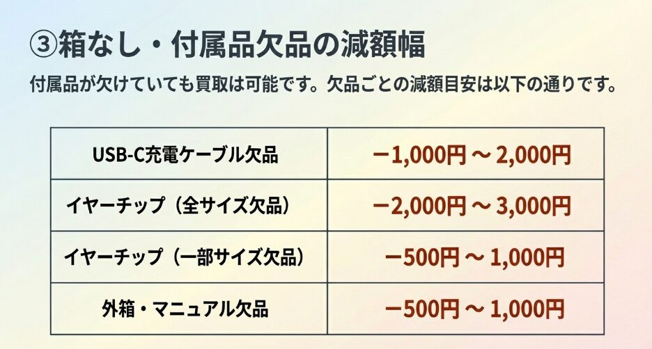- ジャンク品や箱なし、片耳のみの場合の査定減額の基準