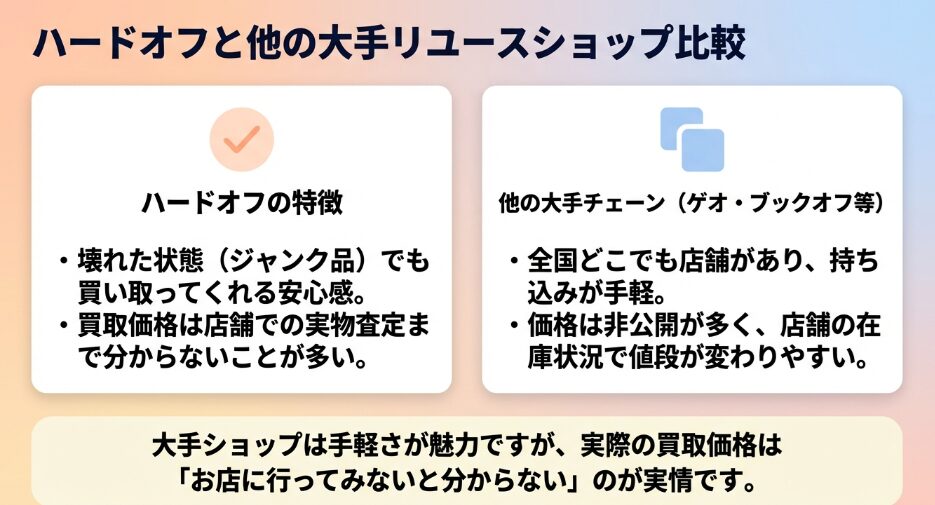 それは、ハードオフは様々な商品を扱う総合店であり、店舗の運営コストが査定額に影響するから。