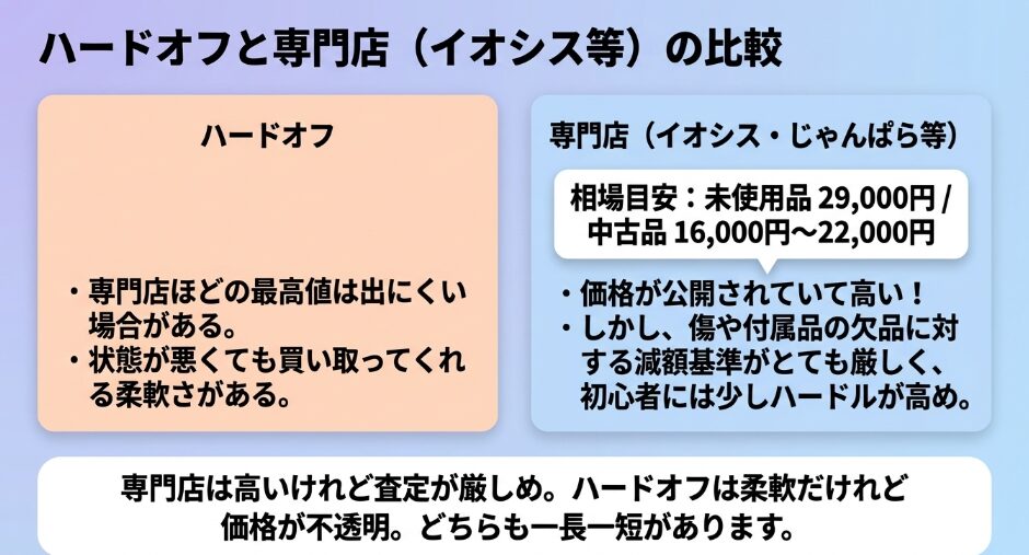 じゃんぱらなどの専門店に持ち込むと、ハードオフより数千円も高い高額査定がつくケースがありますよ。