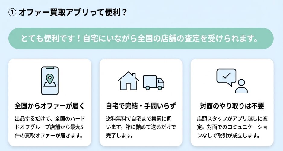 オファー買取アプリは、自宅にいながら全国のハードオフ店舗から査定結果を受け取れる便利なサービスです。