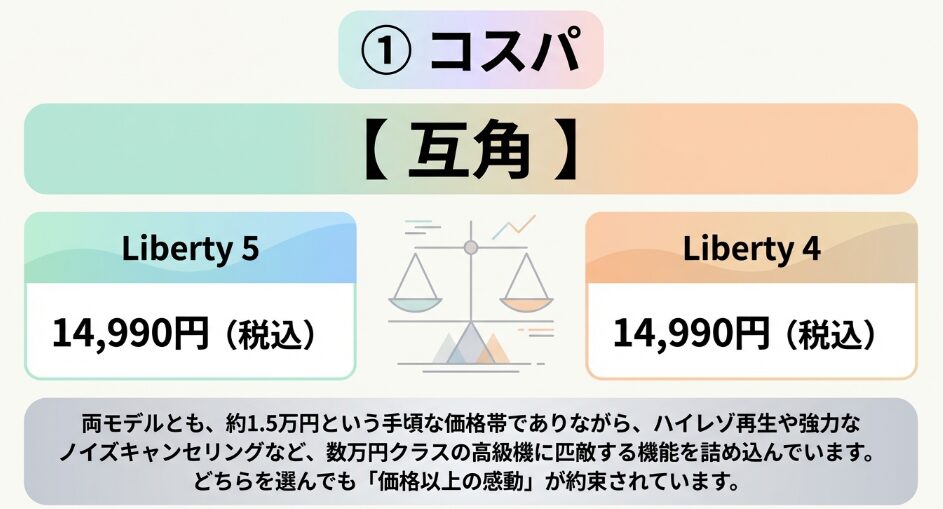 Soundcore Liberty 4と5は、いずれも発売時の定価が14,990円に設定されており、価格設定において明確な差はありません。