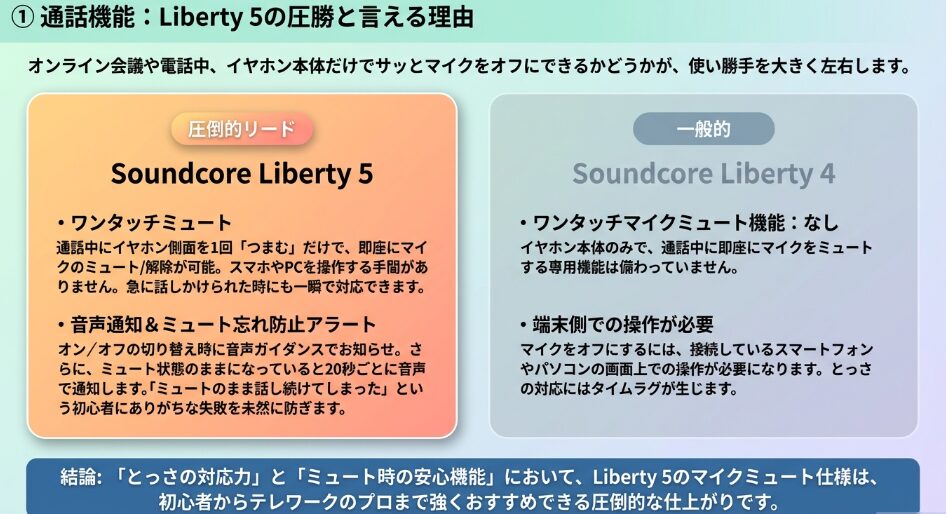 これから新しく購入するのであれば、高音質なLDACとマルチポイントの併用が可能になり、ビジネスで便利なワンタッチミュート機能も備えたLiberty 5を選ぶのが非常に合理的な判断です。