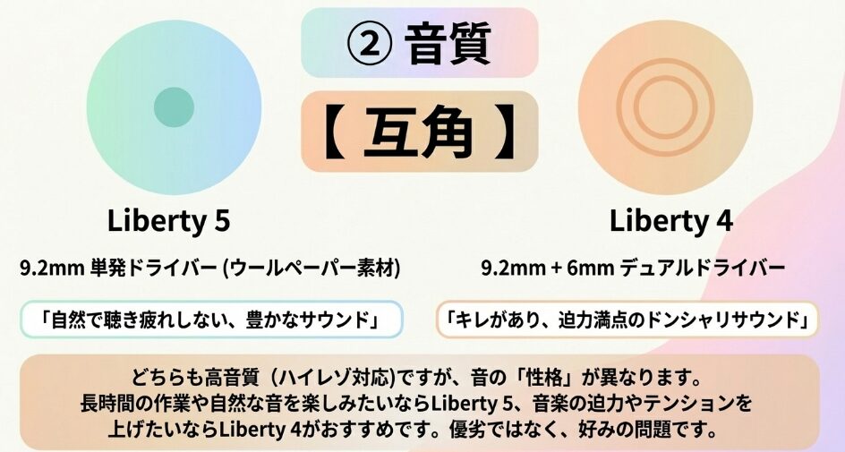 高解像度なキレを求めるならLiberty 4、長時間のリスニングでも耳におだやかな音を求めるならLiberty 5が適しています。