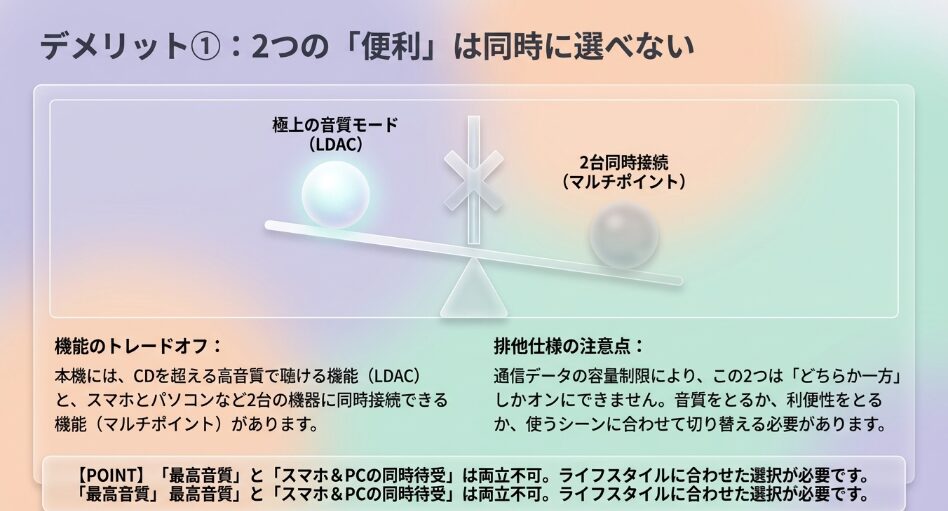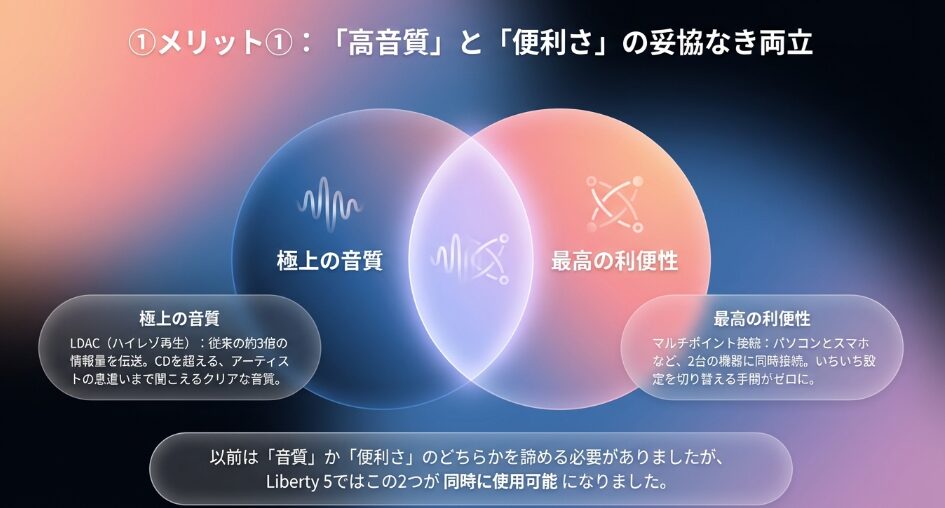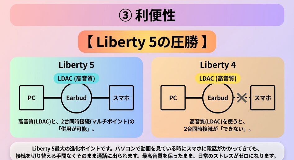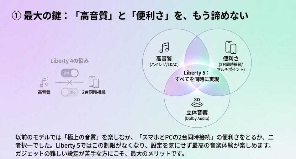 その理由は、旧モデルで多くのユーザーが不満として挙げていた「高音質コーデック(LDAC)と2台同時接続(マルチポイント)の併用不可」という制約が、Liberty 5では無くなったからです。