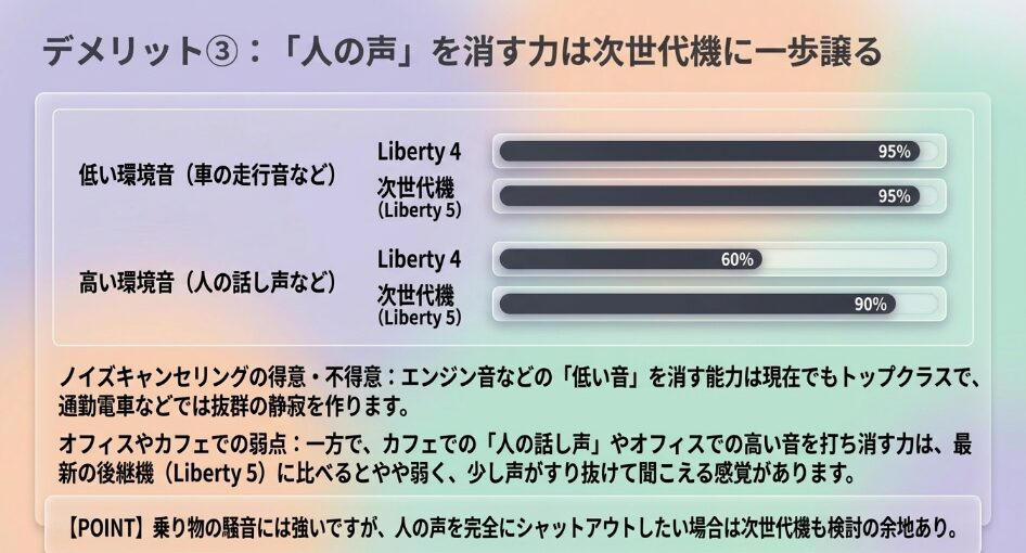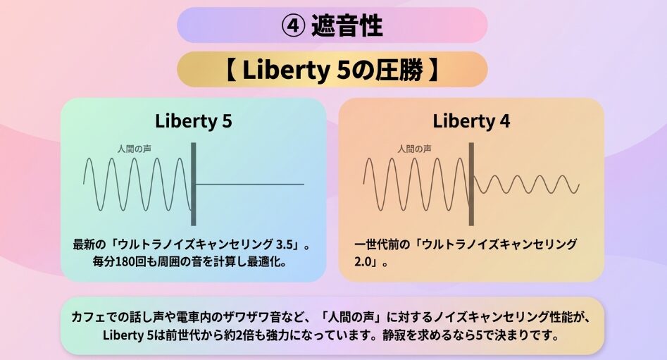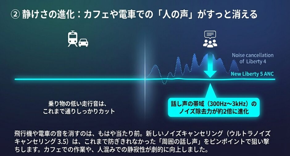 従来のLiberty 4では防ぎきれなかったカフェの話し声や、オフィスの雑音を抑え込む力が強化されています。