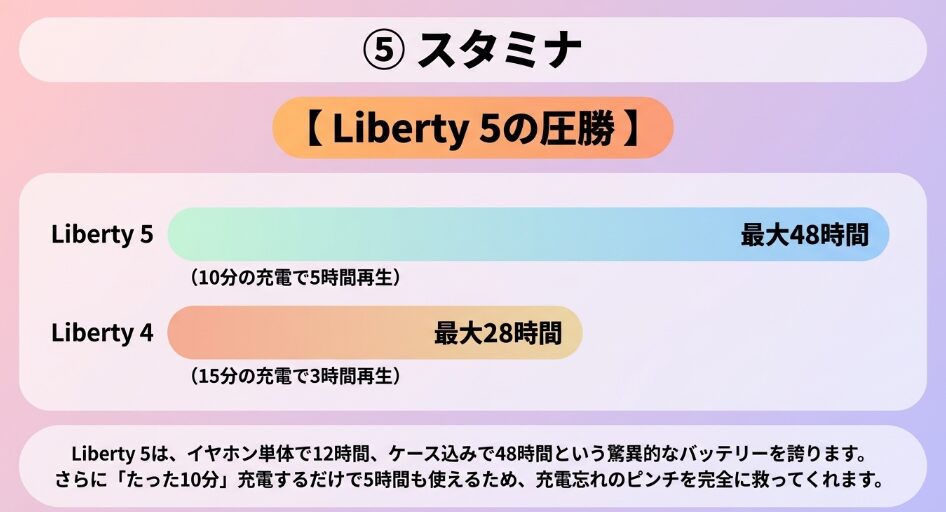 ケースを含めた最大再生時間は、Liberty 4の28時間に対し、Liberty 5は48時間と、約1.7倍の長時間駆動を実現しています。