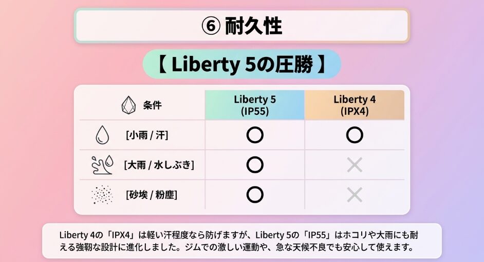 Liberty 4の防水性能が「IPX4(生活防水)」だったのに対し、Liberty 5は「IP55(防塵・防水)」へと強化されています。