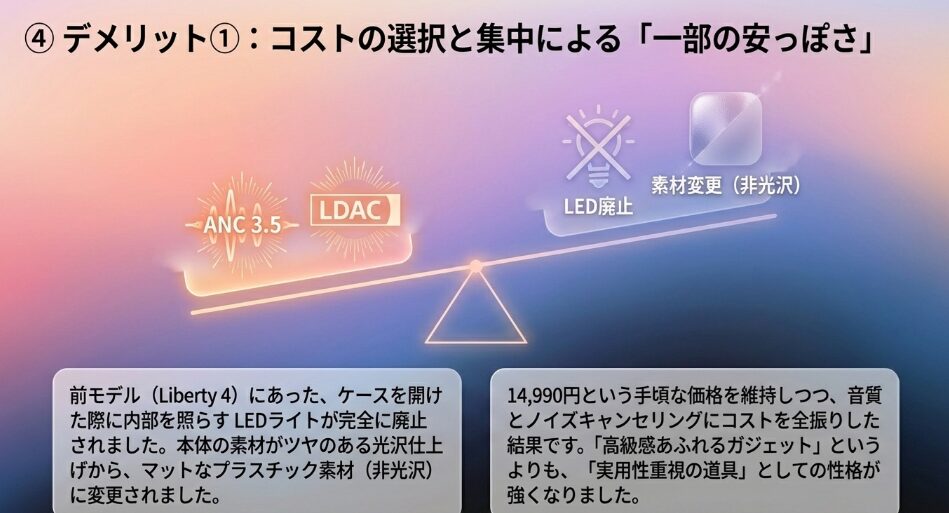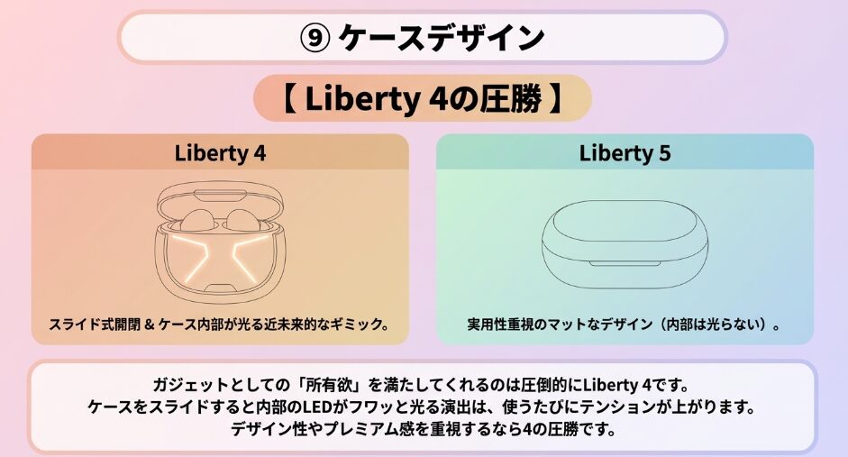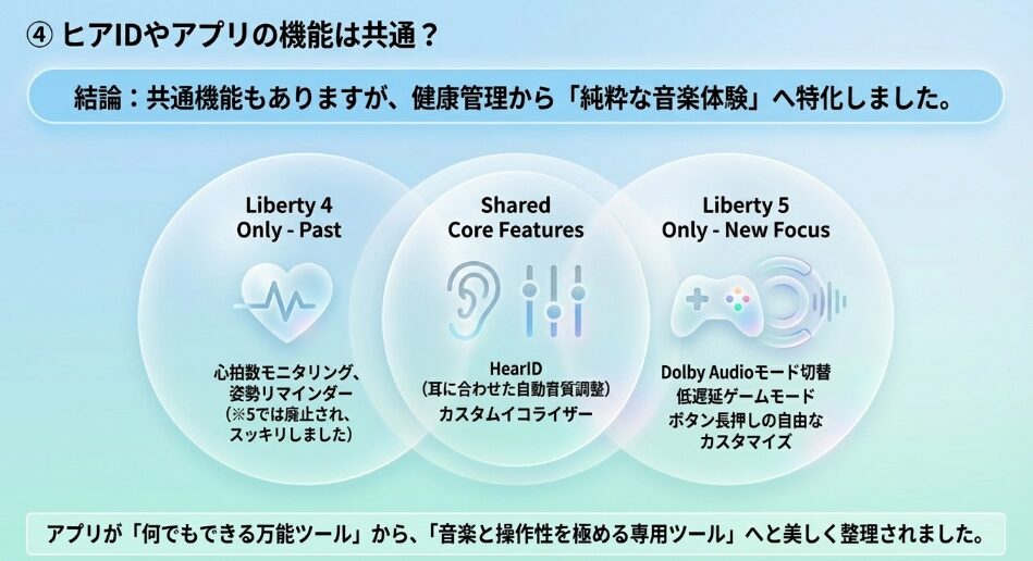 最新のLiberty 5が接続性や静寂性といった「イヤホンの基本機能」を極めた一方で、Liberty 4は「日々の生活を豊かにする付加機能」と「洗練されたデザイン」を両立させています。