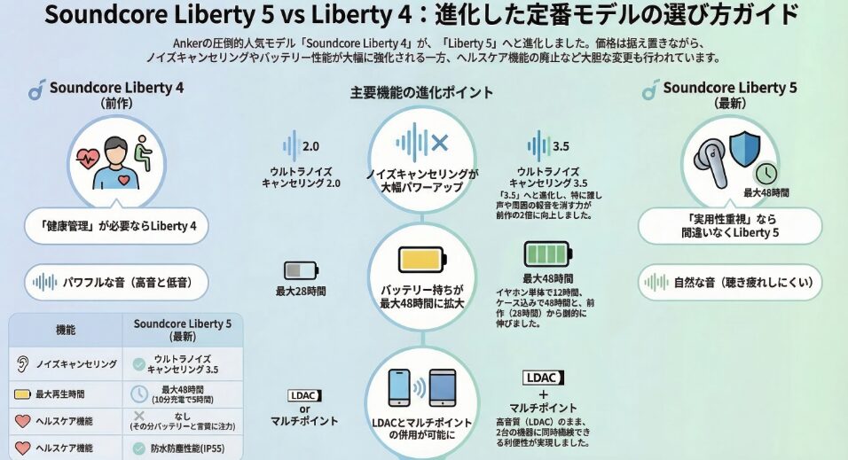 Soundcore Liberty 4とSoundcore Liberty 5の比較において、多くのユーザーが疑問に感じるポイントを整理しました。