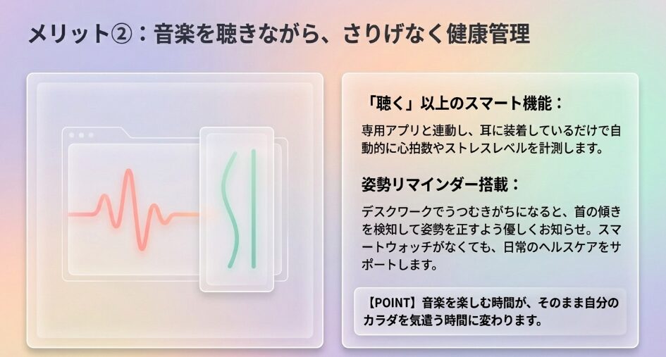 Soundcore Liberty 4は、心拍数測定や姿勢リマインダーなどのヘルスケア機能を搭載しており、日々の健康維持に役立てたいユーザーに最適です。