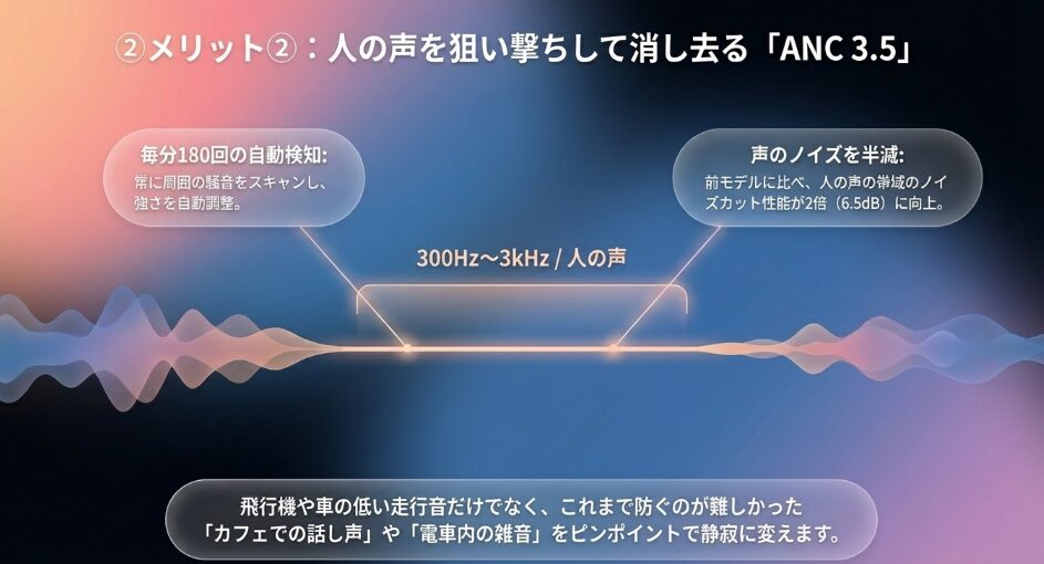 最新の「ウルトラノイズキャンセリング 3.5」は、従来のモデルが苦手としていた「人の話し声」を含む中高域のノイズを抑制する力が強化されています。