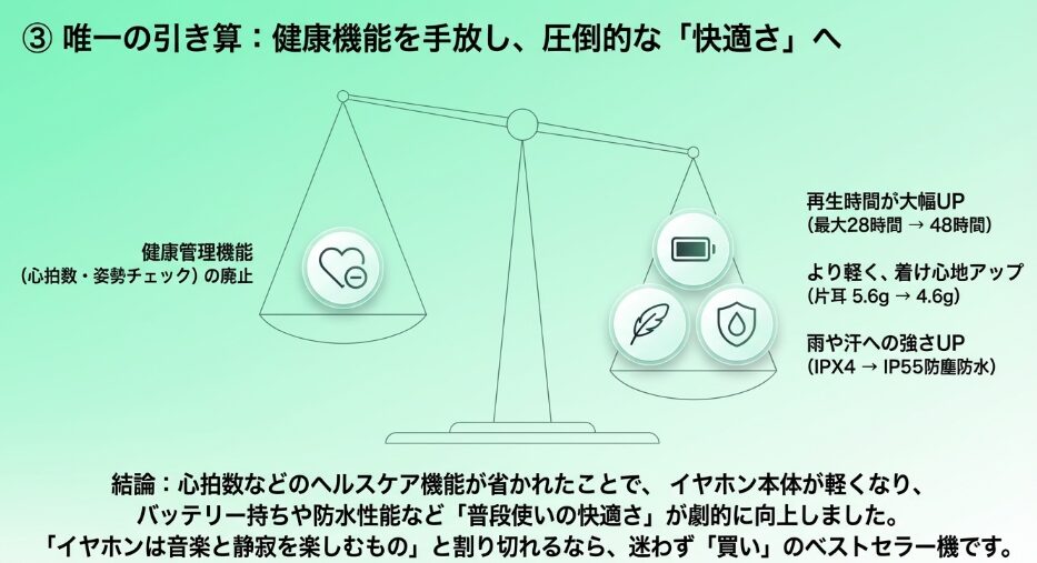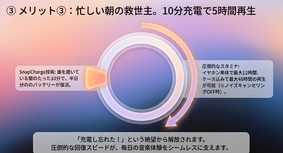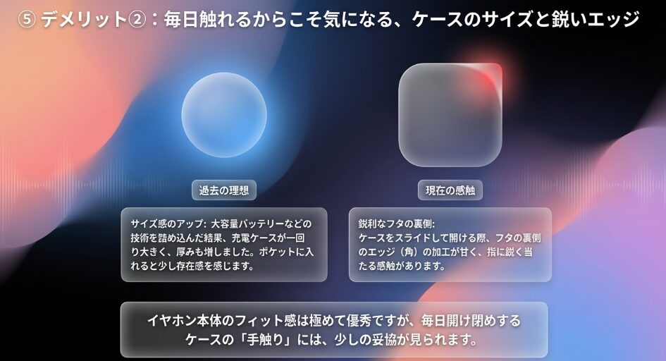 この1点だけでも、毎日イヤホンを使用するユーザーにとっては、買い換えることで得られる時間的・精神的なメリットは大きいはずです。