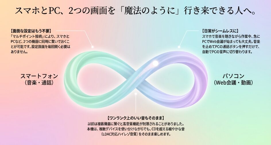 仕事中はPCでWeb会議を行い、休憩時間はスマートフォンで高音質な音楽を楽しむといった切り替えが、設定変更のストレスなしで完結します。
