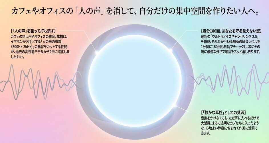 特定の騒音に合わせて自動で強度を調整する精度もアップしており、よりストレスの少ない空間を提供してくれます。