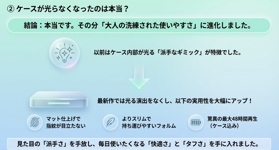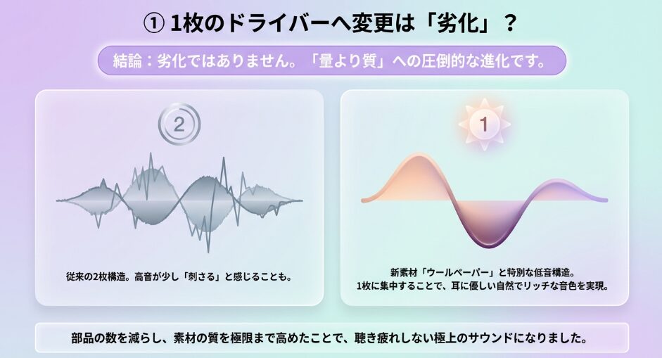具体的には、シングルドライバーへの変更による音質への影響や、ケースの仕様変更、さらには接続環境ごとのメリットについて解説します。