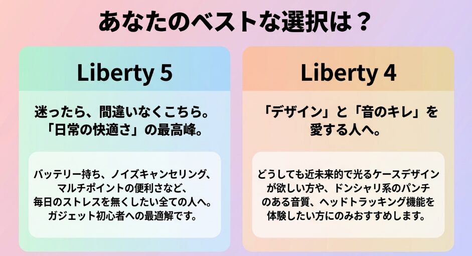 したがって、光るギミックや健康管理機能に強いこだわりがない限り、日々の使い勝手が磨かれたLiberty 5を選ぶことで、より高い満足度が得られるはずです。
