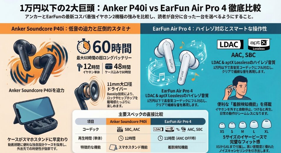今回は、買ってから後悔しないための「EarFun Air Pro 4」と「Anker Soundcore P40i」の明確な判断基準をお伝えします。
