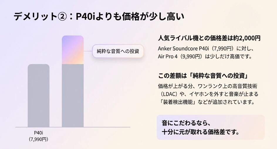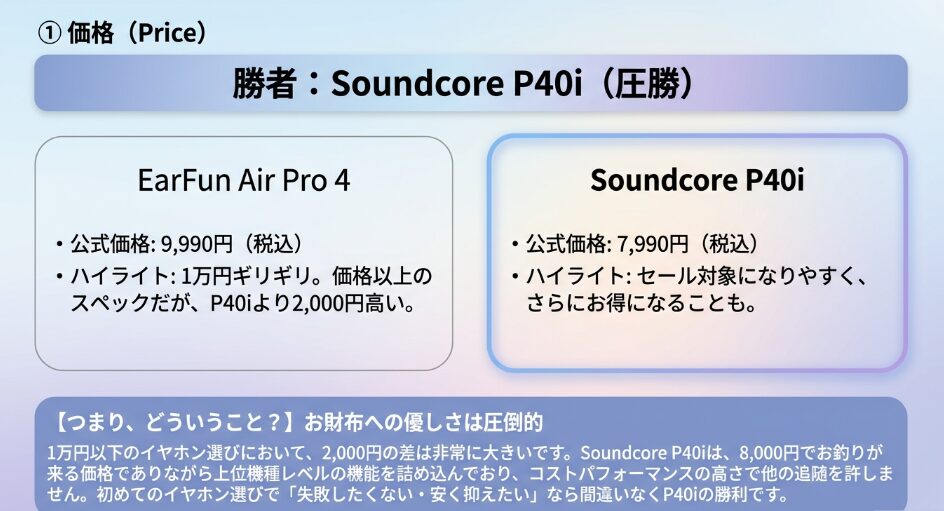 - Anker Soundcore P40iは価格が約2,000円安く、予算を抑えたい人にぴったり