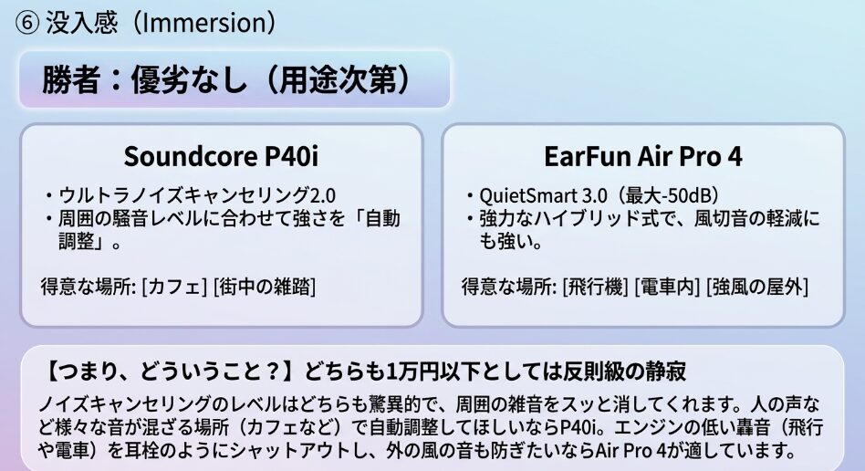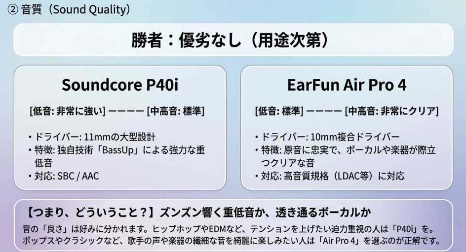 EarFun Air Pro 4とAnker Soundcore P40iは、得意とする領域がはっきりと分かれています。