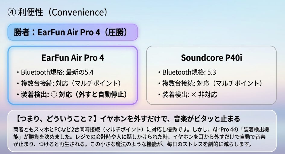 マルチポイント機能には両機種とも対応していますが、日常の細かな手間を省く機能はEarFun Air Pro 4が一段上と言えるでしょう。