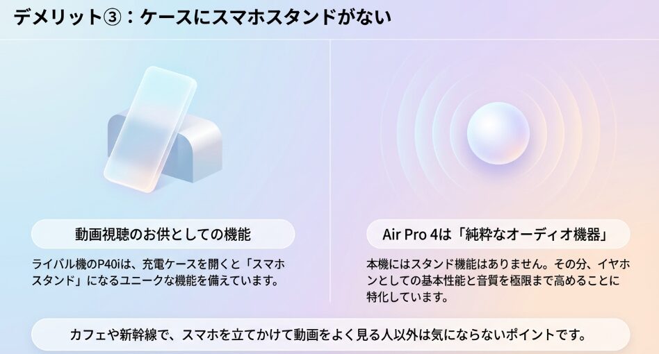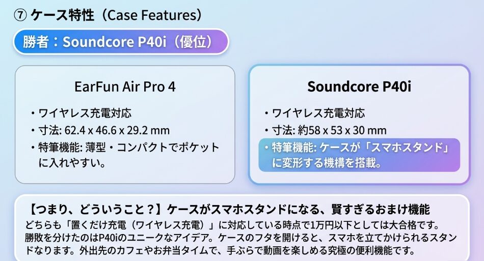 - Anker Soundcore P40iはケースがスマホスタンドになり、外出先での動画視聴に便利