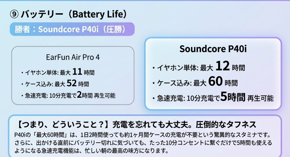 - Anker Soundcore P40iは最大60時間のバッテリーを備え、充電のストレスが少ない