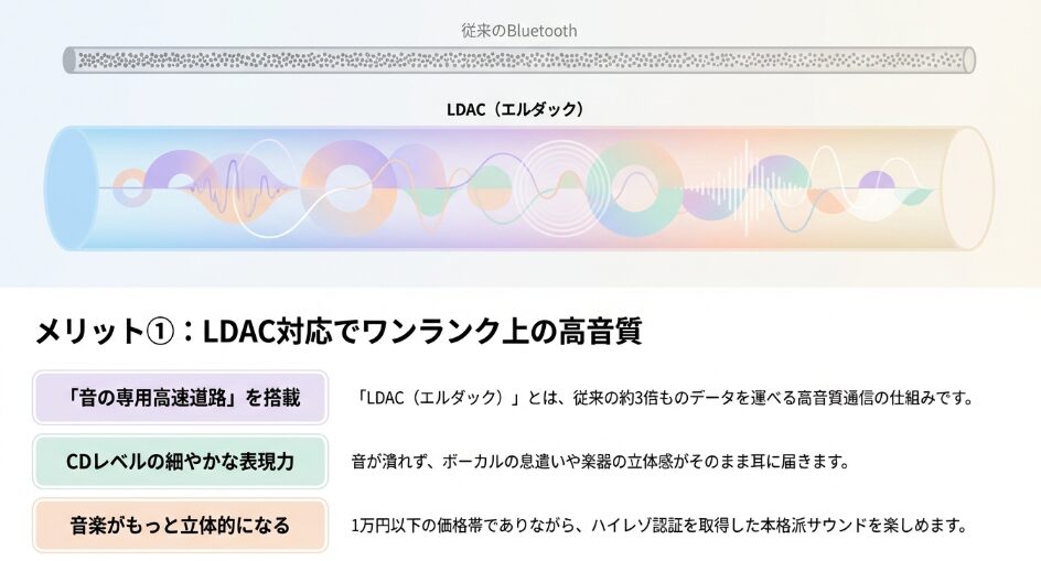 | Androidスマホを利用中 | LDAC接続の恩恵を受けられる | 圧倒的にクリアな音質を楽しめる |