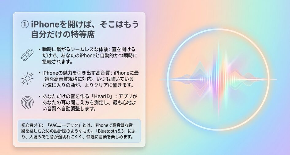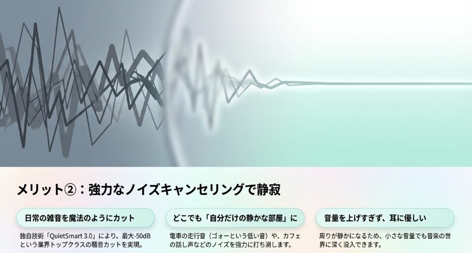 例えば、通勤電車の中やカフェでの作業中に、周囲の雑音を気にせず高解像度な音楽の世界へ深く没入できます。