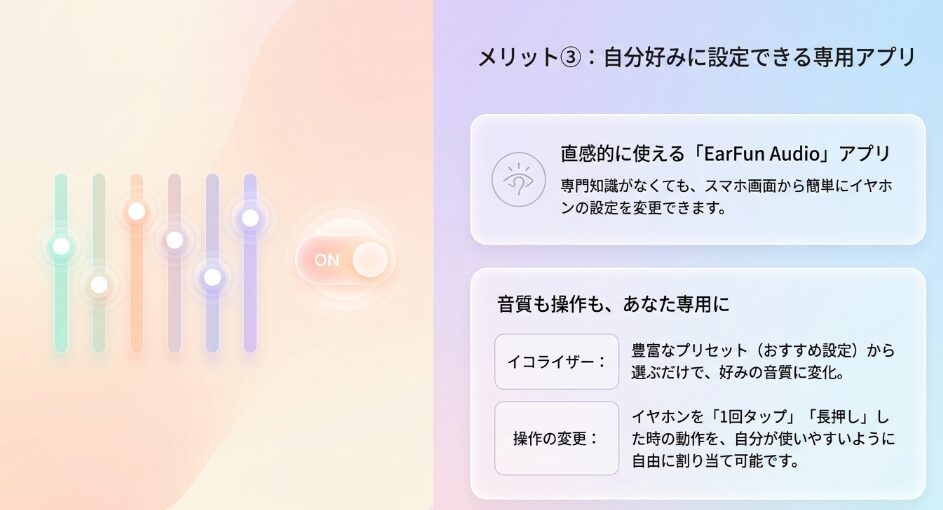 - EarFun Air Pro 4の専用アプリは細かくカスタマイズでき、音色を自分好みに育てられる