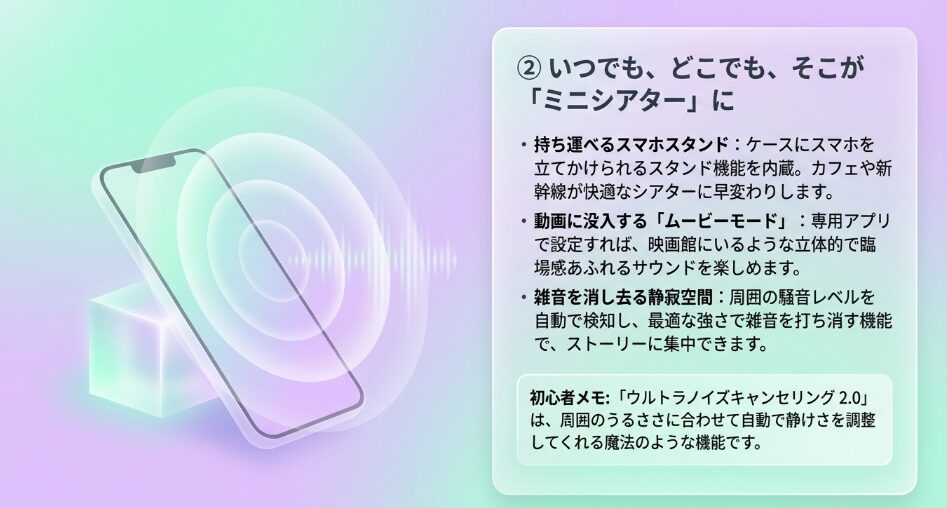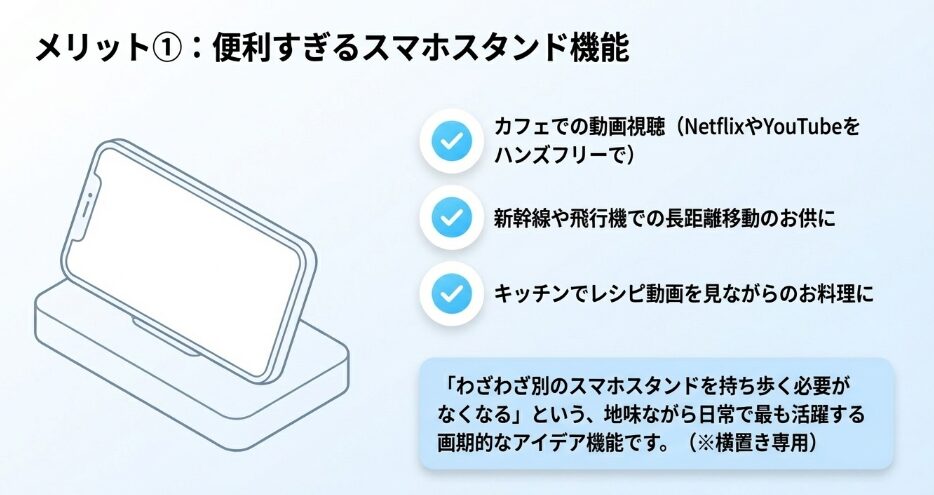 例えば、充電ケースがスマホスタンドになる便利さは、一度使うと手放せなくなります。