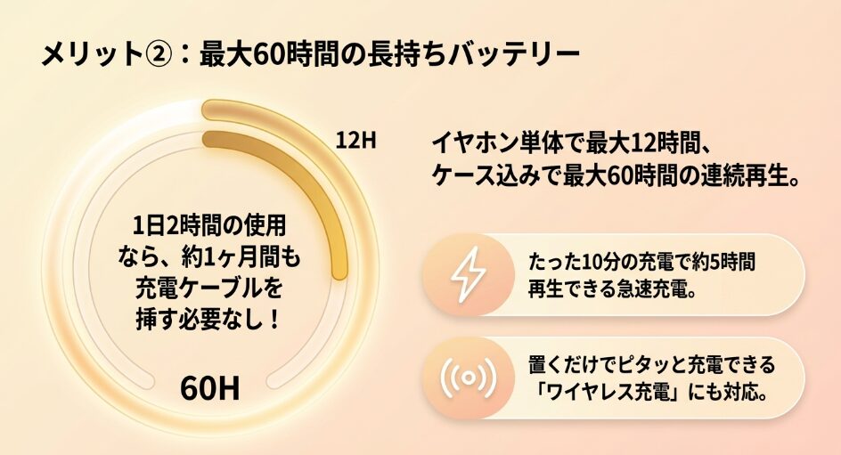 | 長時間移動が多い | イヤホン単体でも最大12時間 | 新幹線や飛行機でも途切れない |
