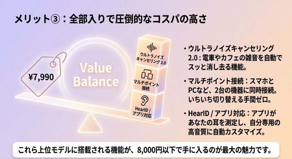| コスパの傾向 | 音質特化のハイコスパ | 機能特化の最強コスパ |