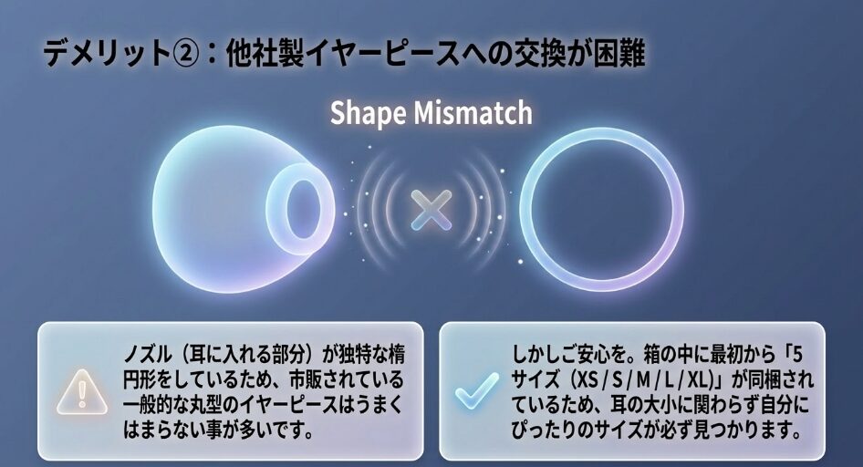対するAnker Soundcore P40iは、楕円形の特殊な形状で他社製への交換が難しいため、万が一耳に合わなかったときのリスクがわずかに存在します。