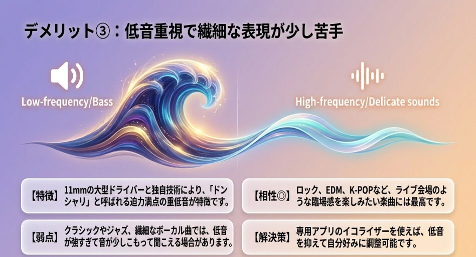 | 迫力ある音が好き | 低音重視のチューニング | ロックやポップスを楽しく聴ける |