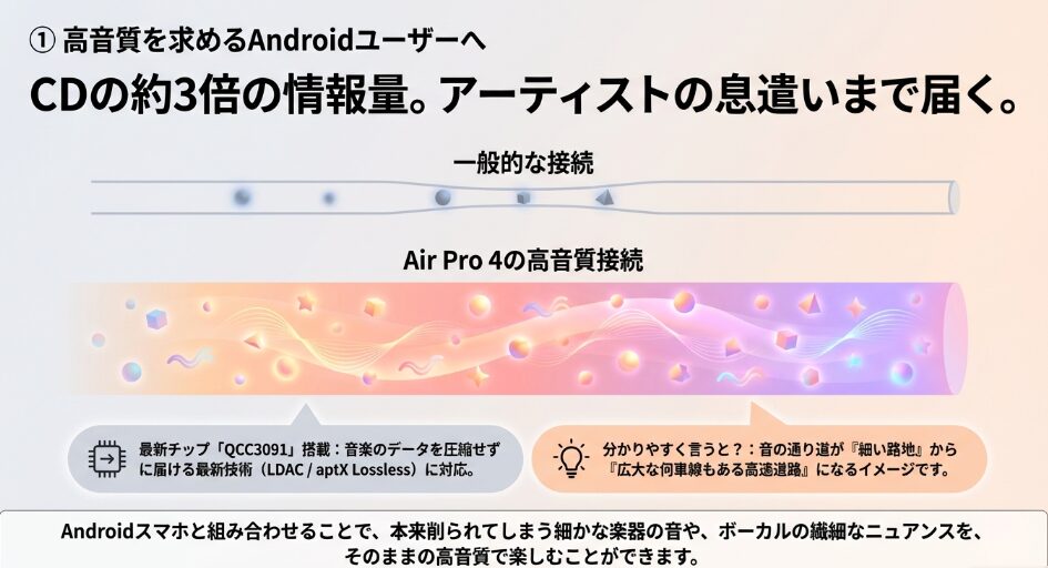 EarFun Air Pro 4は、LDACと呼ばれる高音質規格に対応しているため、音質にこだわるAndroidスマホユーザーに最適です。
