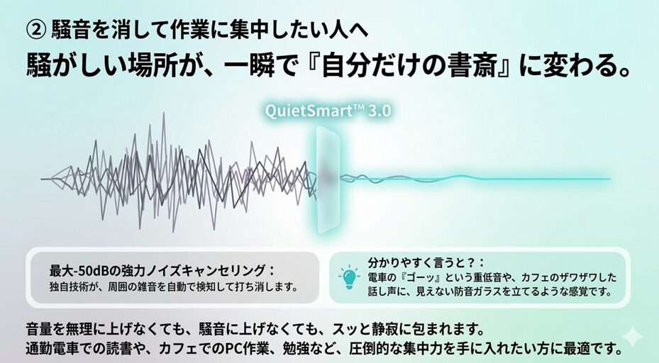 - 通勤や作業中に強力なノイズキャンセリングで静かに集中したい人
