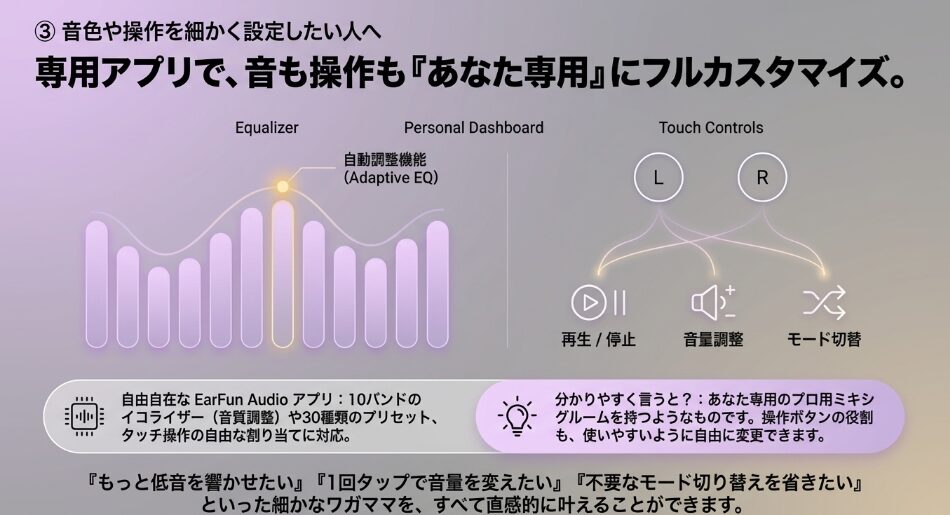 ご自身の好みに合わせてイヤホンを育てていきたい方には、EarFun Air Pro 4の拡張性がぴったりですよ!