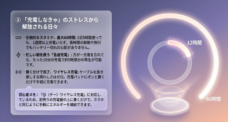 | 充電が面倒くさい | 最大60時間の長持ちバッテリー | 1ヶ月近く充電しなくても使える |