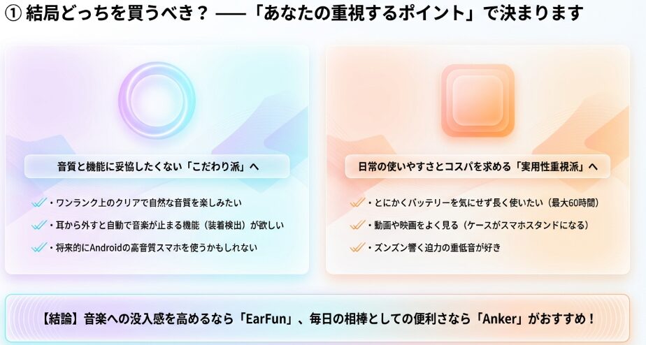 例えば通勤電車で長時間音楽に没入したいならEarFun Air Pro 4が適していますが、出先で動画をよく見るならAnker Soundcore P40iのスマホスタンド機能が圧倒的に便利です。