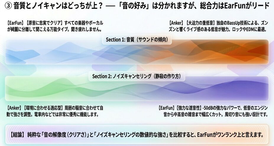 - 音質やノイキャン、バッテリーなど項目別のリアルな勝敗