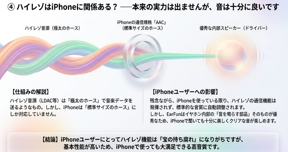 iPhoneはハイレゾ規格のLDACに非対応なため恩恵はありません。