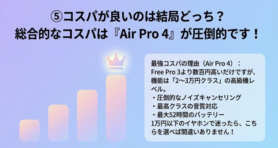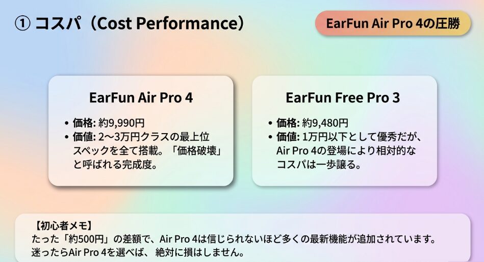どちらも価格以上の性能ですが、総合的なコスパの高さならEarFun Air Pro 4です。