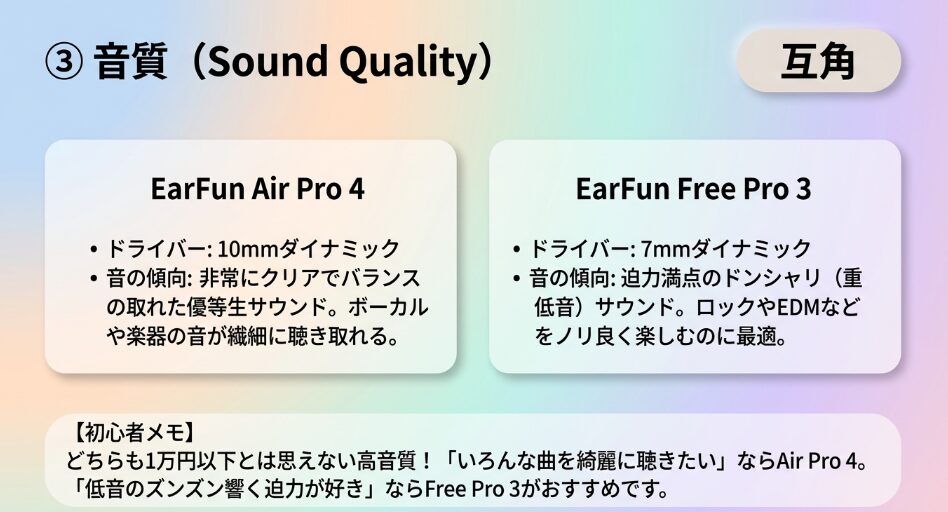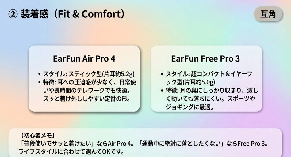 このように、EarFun Air Pro 4は「静寂と音質を重視する人」向け、EarFun Free Pro 3は「軽さと手軽さを重視する人」向けと明確に分かれます。